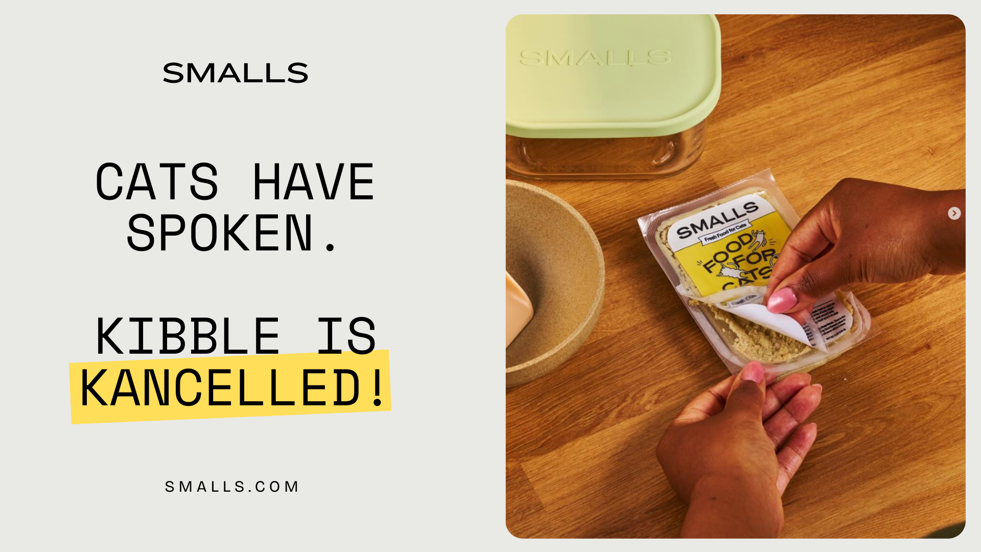 This version keeps the focus tight on the product itself, paired with the headline “Cats Don’t Settle. Cats Choose.” It’s a clean, minimalist way to reinforce the brand promise and put Smalls front and center. By tying the message directly to the product visual, it builds trust that what’s in the bag or box matches the bold claim.